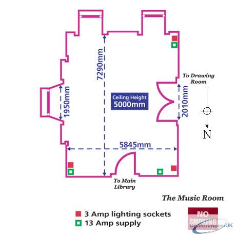 | The Music Room is reached from the Main Library, and is a very bright room with much natural light. It is double aspect with views to the East and South. The room is 7.29m x 5.8m and has a ceiling height of 5.0m. There is a double doorway of 2.0m usable width to the Drawing Room. There are several 13amp ring main outlets located in the corners of the room. (All dimensions are approximate and are subject to client verification). | ||||||||